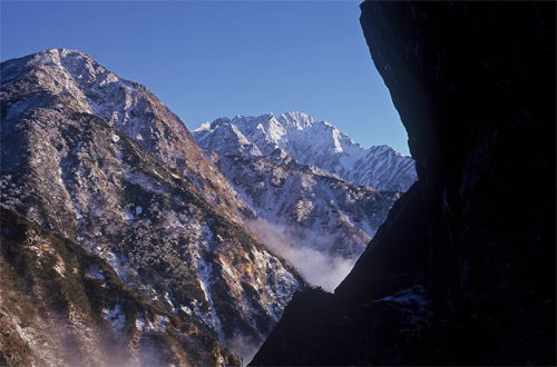 ブナクラ峠の草の生えた急斜面をよじ登る。途中、鋭く切れ落ちた岩場を見つけ、三脚を立てた。正面左に赤谷山、一番奧に剱を配して構図を決める。その意図は明暗の対比、コントラストにある。